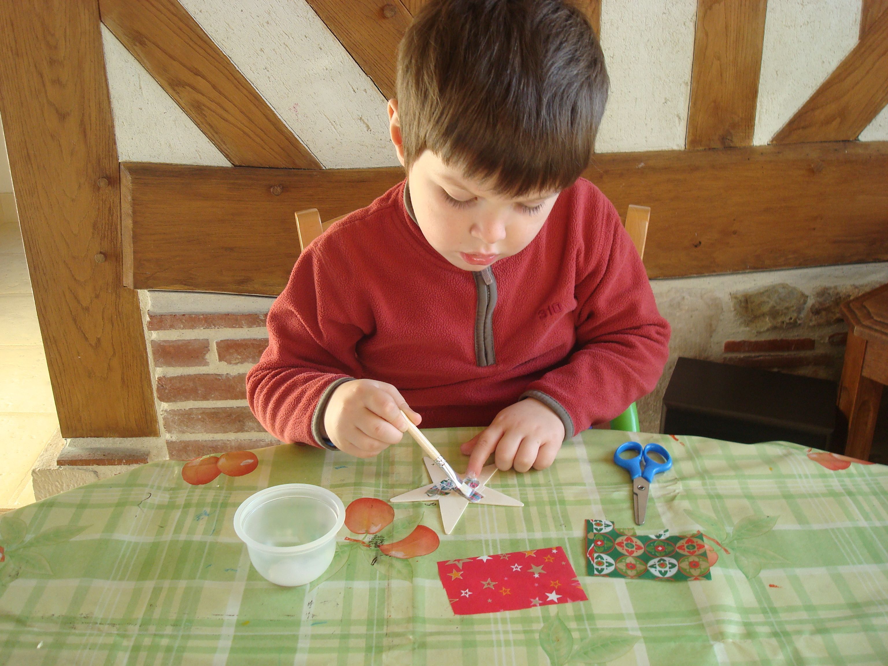 Yann a découpé des feuilles "décopatch" et les a ensuite collées sur son étoile. Un ruban et voici la belle étoile de Yann!